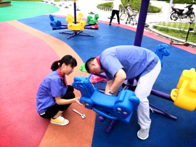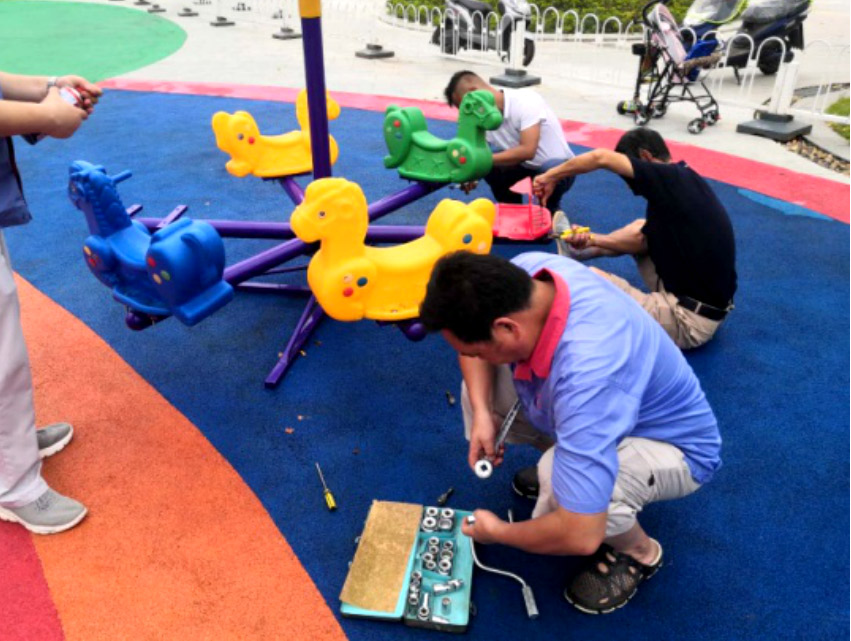 best365足球官网樱花公园的儿童游乐设施安装以后,受到了附近职工住户的青睐,茶余饭后纷纷带孩子过来玩耍。由于设施使用频率高同时长期经受风吹日晒,部分设施出现了零件老化松动的状况。为消除安全隐患,打造个小朋友安心玩耍的场所,8月21日,社区党总支机关党支部房地产公司党小组开展了次特殊的党日活动,对樱花公园儿童乐园内的游乐设施进行完全隐患排查和治理。