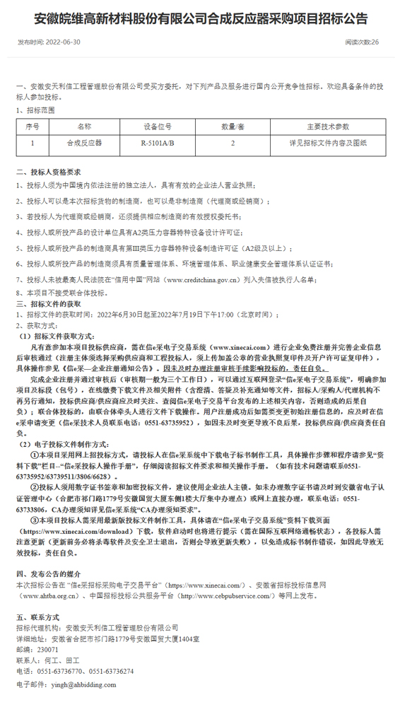best365足球官网材料股份有限公司合成反应器采购项目招标