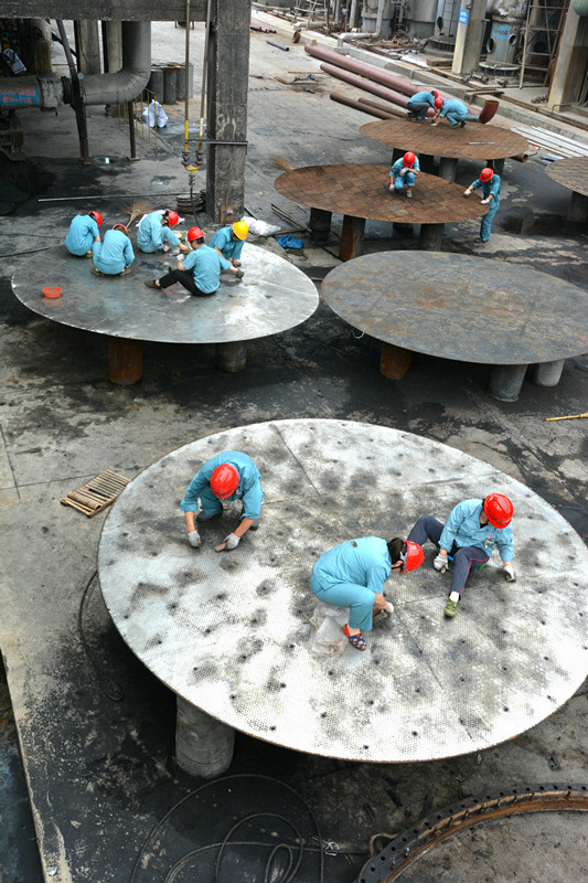 “莲花”——在有机检修现场角,圆形的设备宛如朵盛开的莲花,