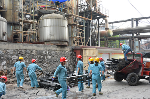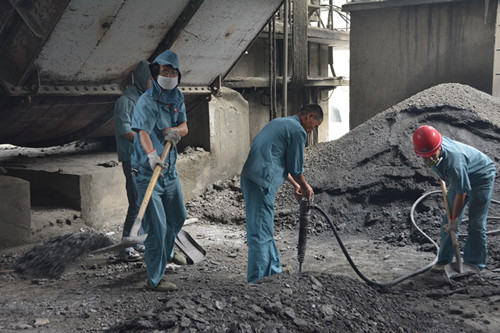 借大修改造之机,水泥分厂对环境进行整治。图为职工在清理积灰
